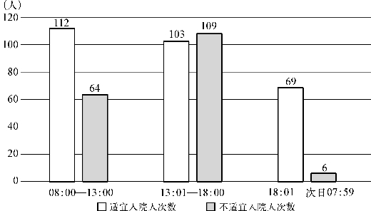 本章对两科室不适宜入院的危险因素进行了探索。心脏科不适宜入院的危险因素包括高自付比、门诊入院、再入院和第一诊断冠心病,骨科则包括在业、医疗费用高自付比以及下午入院。与其他研究所得到的结果一致,在心脏科,门诊入院的患者较急诊入院的患者不适宜入院率更高,其比值比(犗R值)高达7以上,而在西班牙的一项研究中,这一数值高达15[183]。这可能是由于在优质卫生资源稀缺且集中时,医院床位尤其紧张,往往有病床空出时,科室就通知等待名单上的患者办理入院手续,而未考虑相关诊疗程序是否能及时开展,以及患者身体状况是否适宜入院。心脏科再入院患者也属于不适宜入院的高危组,有研究认为,这是由于心血管疾病需要重复入院的可能性更高,而医生则可能选择熟悉的患者优先入院[57],但由于本研究属于回顾性评价,对相关数据可得性较差,暂无法对其进行验证。而第一诊断为冠状动脉粥样硬化性心脏病(冠心病)的患者更易不适宜入院的原因可能是由于冠心病是许多疾病和症状的基础病,而因冠心病入院的患者往往需要及时的高强度的医疗服务和护理/生命支持服务的概率较低。从骨科的情况来看,由于骨科择期手术较多,而在手术前需要进行的检查项目往往仅能在工作时间进行(如非急诊三大常规等),因而在下午办理完入院手续后,需要等到次日医师查房后按照医嘱进行,那么在当日入院则属于过早入院。骨科不适宜入院人次与入院时间的情况如图4-3所示。结合对适宜性入院的定义,本研究认为,医生对于下午入院的患者应审慎考虑患者的病情和行动能力、患者家庭照顾情况以及相关检查的可及性来安排入院。年龄在本研究中不是不适宜入院的危险因素,这与许多研究的结果类似:这是由于年龄越大,其对于相对强度更高的医疗服务需求也更大,而其不适宜入院率可能也相对较低。合并症的查尔森得分也不是不适宜入院的危险因素,但在骨科的不适宜入院水平研究中可以发现,合并症指数得分为1的患者不适宜入院率高于其他组别,这可能是由于CCI得分高的患者往往病情更为复杂所导致,如糖尿病患者在入院前血糖控制不当导致入院后无法开展某些检查项目和手术项目。是否节假日入院也不是不适宜入院的危险因素,且工作日入院的患者不适宜入院率还略高,这可能是由于选择节假日至医院进行诊疗的患者本身病情较严重,需要的医疗服务也更加迫切。