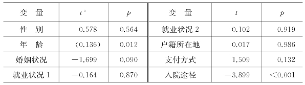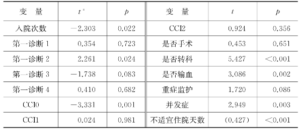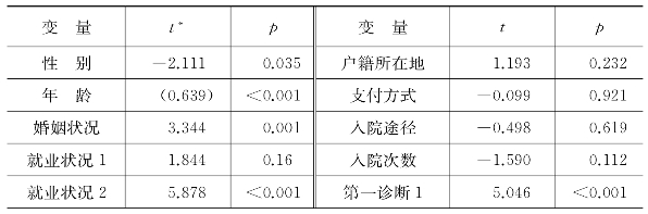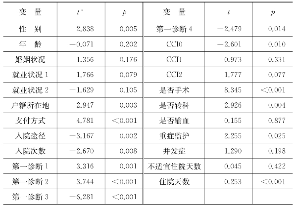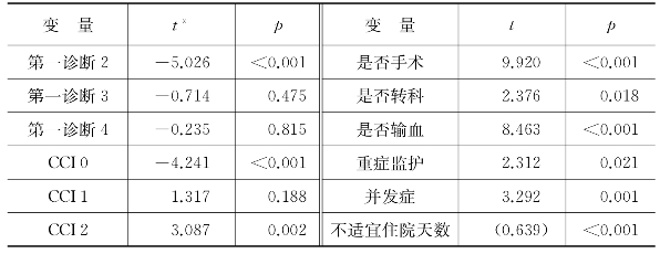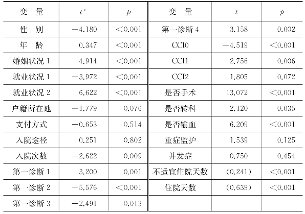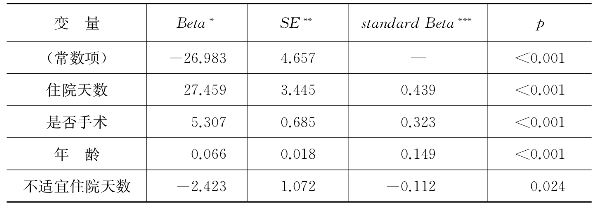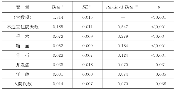 对骨科患者的住院费用进行单因素和多因素分析,结果分别如表5-21和表5-22所示。单因素分析中,与骨科住院费用显著相关的变量有性别(t=-4.180,p<0.001)、年龄(Pearson correlation=0.347,p<0.001)、婚姻状况(t=4.914,p<0.001)、就业状况1(t=-3.972,p<0.001)、就业状况2(t=6.622,p<0.001)、户籍所在地(t=-1.779,p=0.076)、入院次数(t=-2.622,p=0.009)、第一诊断1(t=3.200,p=0.001)、第一诊断2(t=-5.576,p<0.001)、第一诊断3(t=-2.491,p=0.013)、第一诊断4(t=3.158,p=0.002)、CCI 0(t=-4.519,p<0.001)、CCI1(t=2.756,p=0.006)、CCI2(t=1.805,p=0.072)、是否手术(t=13.072,p<0.001)、是否转科(t=2.120,p=0.035)、是否输血(t=6.209,p<0.001)、重症监护(t=1.539,p=0.125)、不适宜住院天数(Pearson correlation=0.241,p<0.001)以及住院天数(Pearson correlation=0.639,p<0.001)。在多因素分析中显著的变量有住院天数(standard Beta=0.439,p<0.001)、手术(standard Beta=0.323,p<0.001)、年龄(standard Beta=0.149,p<0.001)、不适宜住院天数(standard Beta=-0.112,p=0.024)。其中住院天数多、接受了手术、年长的患者住院费用高,而不适宜住院天数多的患者住院费用低。但此时尚不能对不适宜住院天数对住院费用的影响做出结论,这是由于多元回归模型仅考察了直接效应,而根据本研究的基本模型,不适宜住院日还通过住院天数造成影响,对其间接效应和总效应还需要建立路径模型做进一步的探讨。