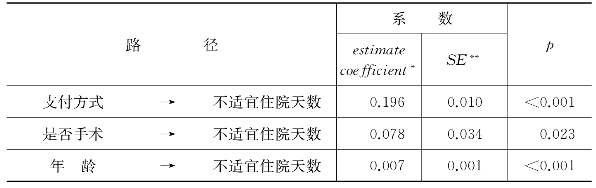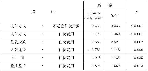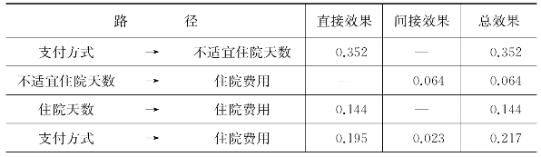 从路径分析的结果来看,在两个样本科室,支付方式对不适宜住院天数均产生了直接影响,尤其是在心脏科路径分析模型中,仅有支付方式对不适宜住院天数的直接路径系数通过了统计学检验,而骨科的不适宜住院天数还受年龄和手术情况的直接影响。不适宜住院天数对住院费用有直接影响也有间接影响,而支付方式通过对不适宜住院天数的影响对住院费用产生间接影响。当其价格与适宜住院日差距不大时(心脏科),不适宜住院日仅通过住院天数对住院费用产生间接影响,而当其价格显著低于适宜住院日时(骨科),不适宜住院日对住院费用的直接路径系数为负。支付方式在两科室均不对住院天数造成直接影响,而是通过影响不适宜住院日对住院天数造成影响。简而言之,路径分析的结果表示,在住院治疗过程中,在保障一定质量目标的基础上,在不同支付方式下,由于效用最大化行为产生了一定的不适宜住院日,从而对住院资源配置效率产生了影响。