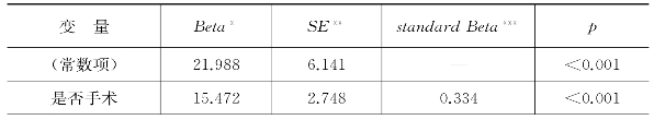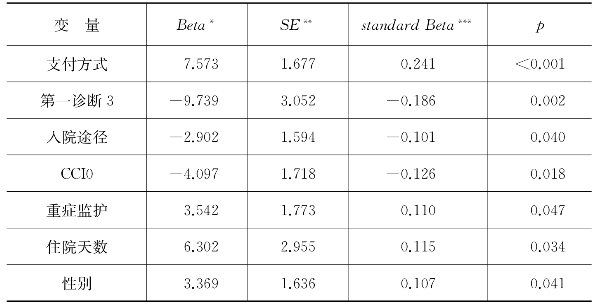 心脏科住院费用单因素和多因素分析结果分别见表5-14和表5-15。在单因素分析中对与住院费用显著相关的变量有性别(t=2.838,p=0.005)、就业状况1(t=1.766,p=0.079)、户籍所在地(t=2.947,p=0.003)、住院费用支付方式(t=4.781,p<0.001)、入院途径(t=-3.167,p=0.002)、入院次数(t=-2.670,p=0.008)、第一诊断1(t=3.316,p=0.001)、第一诊断2(t=3.744,p<0.001)、第一诊断3(t=-6.281,p<0.001)、第一诊断4(t=-2.479,p=0.014)、CCI 0(t=-2.601,p=0.010)、CCI 2(t=1.777,p=0.077)、是否手术(t=8.345,p<0.001)、是否转科(t=2.926,p=0.004)、重症监护(t=2.255,p=0.025)、并发症情况(t=1.290,p=0.198)、住院天数(t=0.253,p<0.001)。从多因素分析的结果来看,手术(Beta=15.472,p<0.001)、自费(Beta=7.573,p<0.001)、重症监护(Beta=3.542,p=0.047)、住院天数多(Beta=6.302,p=0.034)以及男性患者(Beta=3.369,p=0.041)的住院费用更高;而第一诊断为慢性病(高血压)(Beta=-9.739,p=0.002)、门诊入院(Beta=-2.902,p=0.040)、合并症指数为0(Beta=-4.097,p=0.018)的患者住院费用较低。