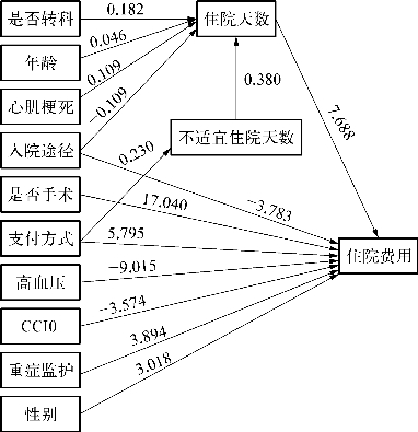 根据上述路径分析结果,对原模型进行调整,调整后的路径模型如图5-12所示,共有17个回归系数,其中固定路径3个,待估计的路径14个。调整后的模型拟合情况统计量结果如表5-16所示,χ2=97.456,自由度df=48,χ2/df=2.030,RMSEA为0.055<0.100,CFI为0.915>0.900,CN值为229>200,各项指标均表示该路径模型拟合情况良好。路径分析的最大似然估计结果如表5-17所示。其中,对住院费用有直接影响的路径有8条,分别是“支付方式→住院费用”(估计系数为5.795,p<0.001)、“住院天数→住院费用”(估计系数为7.688,p=0.002<0.050)、“入院途径→住院费用”(估计系数为-3.783,p=0.009<0.050)、“性别→住院费用”(估计系数为3.018,p=0.035<0.050)、“重症监护→住院费用”(估计系数为3.894,p=0.013<0.050)、“CCI 0→住院费用”(估计系数为-3.574,p=0.016<0.050)、“第一诊断3→住院费用”(估计系数为-9.015,p=0.001<0.050)、“是否手术→住院费用”(估计系数为17.040,p<0.001),即自费、住院天数长、非门诊入院(急诊/其他医疗机构抓入)、男性、实施了重症监护、有合并症、第一诊断非高血压、实施了手术对住院费用产生正向影响。在调整模型后,仅有支付方式对不适宜住院天数产生直接影响,其路径系数为0.230,p<0.001。
