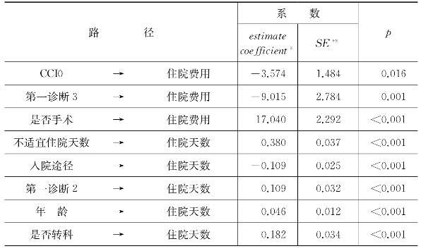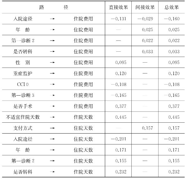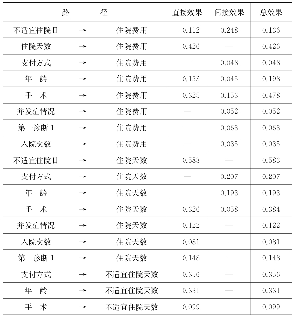 根据上述路径分析结果,对原模型进行调整,调整后的路径模型共有15个回归系数,其中固定路径3个,待估计的路径12个。拟合情况统计量结果如表5-23所示,χ2=53.504,自由度df=17,χ2/df=3.147,RMSEA为0.068,GFI为0.958,CN值为239,各项指标均表示该路径模型拟合情况良好。根据路径分析的最大似然估计结果如表5-24所示。其中,对住院费用有直接影响的路径有四条,分别是“住院天数→住院费用”(估计系数为26.381,p<0.001)、“不适宜住院天数→住院费用”(估计系数为-2.334,p=0.017<0.050)、“是否手术→住院费用”(估计系数为-5.293,p<0.001)“以及年龄→住院费用”(估计系数为-0.067,p<0.001)。不适宜住院天数对住院天数的路径系数为0.196,p<0.001;而与多元回归结果一致的是,不适宜住院天数对住院费用的直接路径系数为负(-2.334,p=0.017<0.050),与理论推导中的结果一致。