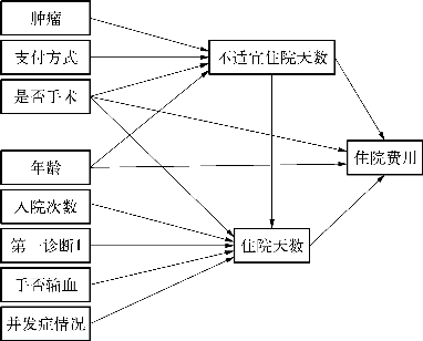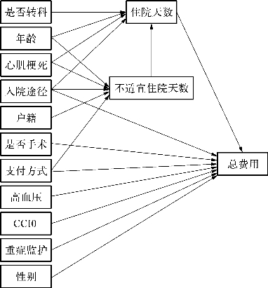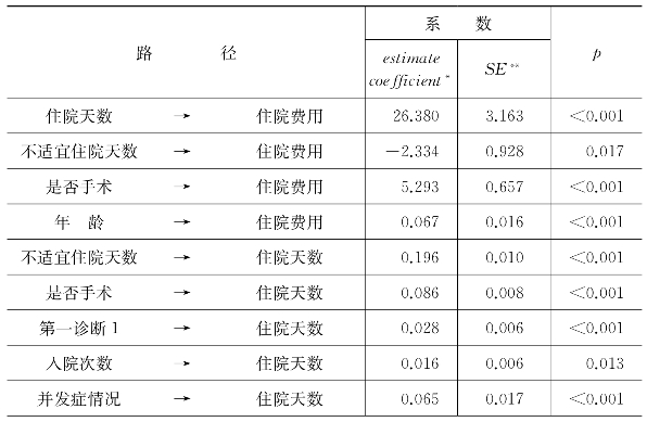 以上均为将连续变量进行正态转换后所得的结果,按照变量原值带入路径分析模型后,可以进行粗略估计,每增加一个不适宜住院日,对应住院费用的路径系数(未标准化的)为1223.685。由于此期间不适宜住院日的天数为753天,由此可推测,该期间由于内部因素引起的不适宜住院日带来的住院资源的浪费约为921435元。按照该科室平均住院费用33884.22元的标准,这部分资源还可用于27名患者的诊治,并提供约753天的适宜住院日。