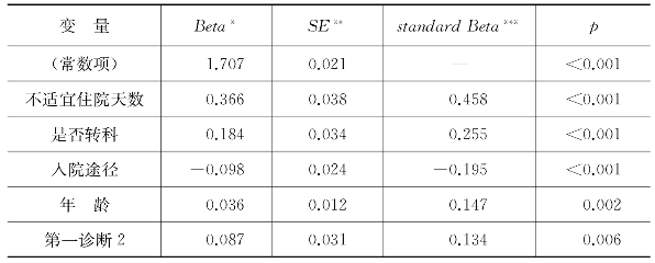 首先对路径分析的3个主要内因变量(不适宜住院天数、住院天数和住院费用)进行单因素和多因素分析。心脏科住院天数的单因素和多因素分析结果分别如表5-12和表5-13所示。在单因素分析中,与心脏科住院天数显著相关的变量有年龄(t=0.136,p=0.012)、婚姻状况(t=-1.699,p=0.090)、支付方式(t=1.509,p=0.132)、入院途径(t=-3.899,p<0.001)、入院次数(t=-3.899,p<0.001)、第一诊断2(t=2.261,p=0.024)、第一诊断3(t=0.410,p=0.083)、CCI 0(t=-3.331,p=0.001)、是否转科(t=5.427,p<0.001)、是否输血(t=3.086,p=0.002)、重症监护(t=1.720,p=0.086)、不适宜住院天数(t=0.427,p<0.001)。心脏科住院天数的多因素分析结果显示,不适宜住院天数(Beta=0.366,p<0.001)、是否转科(Beta=0.184,p<0.001)、入院途径(Beta=-0.098,p<0.001)、年龄(Beta=0.036,p=0.002)以及第一诊断2(Beta=0.087,p=0.006)与心脏科住院天数相关性显著。