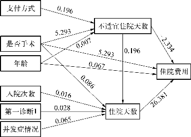 在最终模型(如表5-25所示)中,对住院费用总效果值最大的依然为是否手术(0.478),其他依次为住院天数(0.426)、年龄(0.198)、不适宜住院日(0.136)、第一诊断1(0.063)、并发症情况(0.052)、支付方式(0.048)以及入院次数(0.035)。不适宜住院天数对住院费用既有直接影响(-0.112)也有间接影响(0.248),其总效果值为0.136;住院天数对住院费用的直接效果为0.426,总效果值也为0.426;支付方式对住院费用的影响在单因素和多因素分析中均不显著,在本研究的路径分析模型中,支付方式对住院费用产生的总效应为0.048。根据调整后的路径(见图5-14),支付方式通过影响不适宜住院天数从而对住院天数和住院费用产生影响。