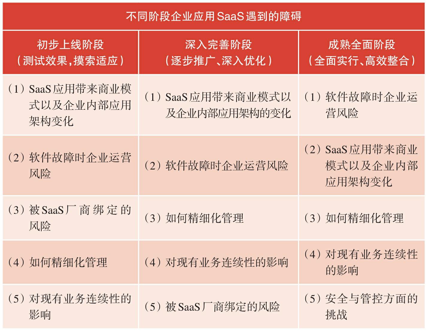 不同阶段企业应用SaaS会遇到不同的问题。比如初步使用SaaS的企业最担心遇到被SaaS服务商绑定的风险以及对现有业务连续性的影响;深入和完善使用SaaS的企业对现有业务连续性的影响、被SaaS服务商绑定的风险最为关注;成熟和全面应用SaaS的企业除了担心对现有业务连续性的影响外,还会担心安全与管控方面的挑战(见图3.21)。