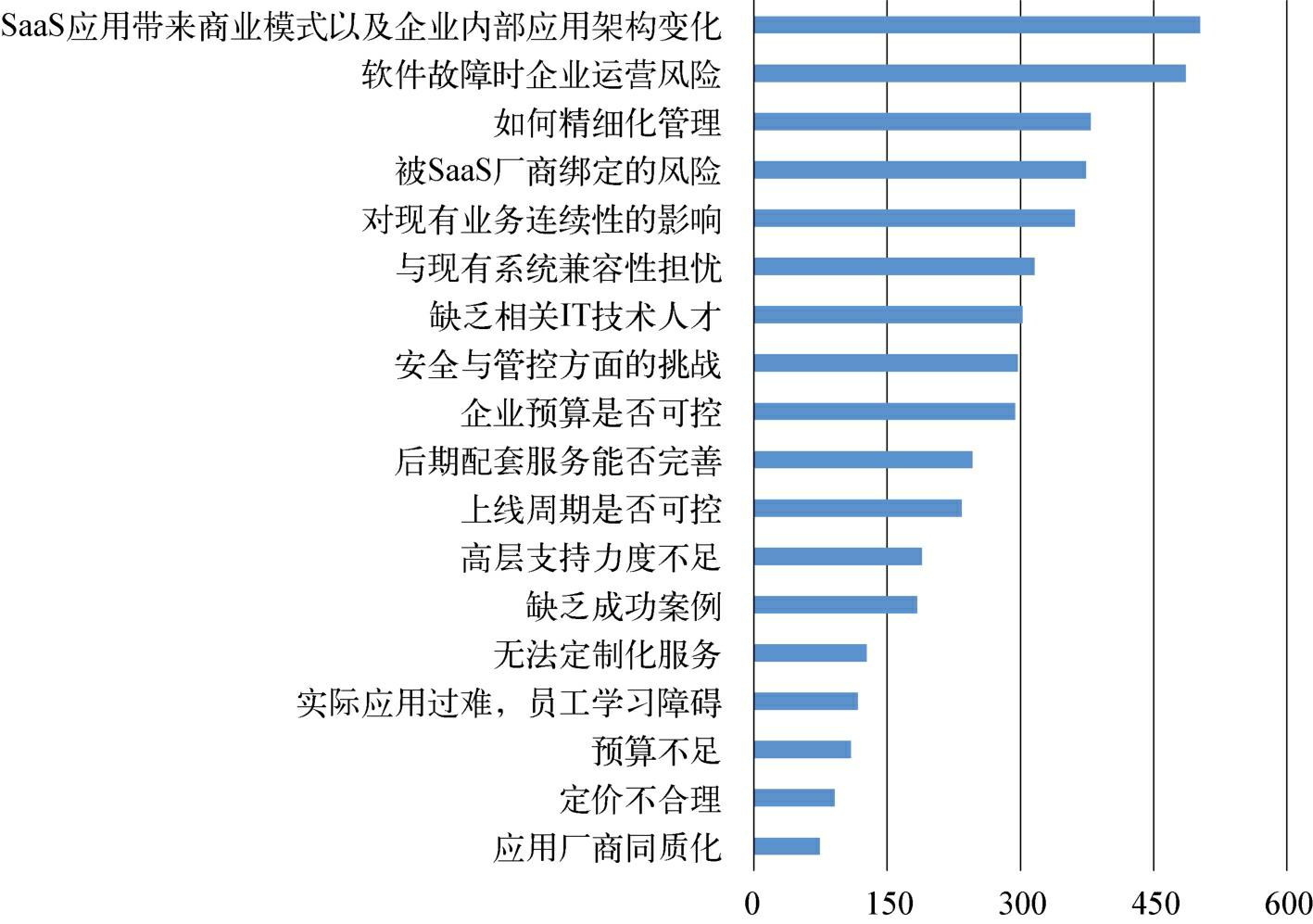 不同企业在不同的阶段使用SaaS软件服务时会遇到不同的问题。从总体上来看,SaaS的应用会给企业带来商业模式以及企业内部应用架构的变化,这种变化需要企业里的每一个人去适应,这样的动荡期是很多企业在导入SaaS软件服务时最先遇到的问题。此外,有时SaaS软件遭遇故障,企业也不得不承担其中的运营风险。这两点是企业在不同SaaS使用阶段都会遇到的最紧迫的障碍(见图3.20)。