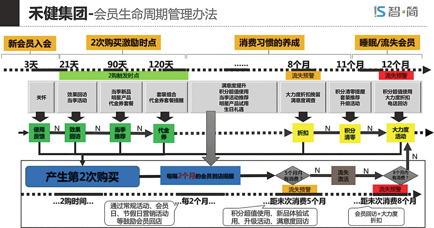 当企业有了清晰的用户画像之后,需要针对会员生命周期进行管理。在主营膳食营养补充剂的上海禾健营养食品股份有限公司案例中,有详细到一整年的用户管理流程。