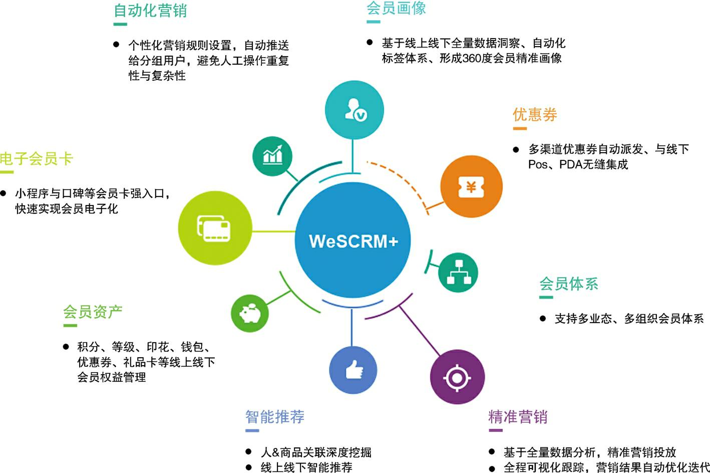 全面实现会员数字化,统一管理线上线下会员资产,通过消费者行为分析,刻画出全维度会员画像,进行优惠券及活动的精准营销、商品的智能推荐,持续增加门店的流量与销售额。打通并链接个人微信与企业微信,实时触达(见图4.10)。
