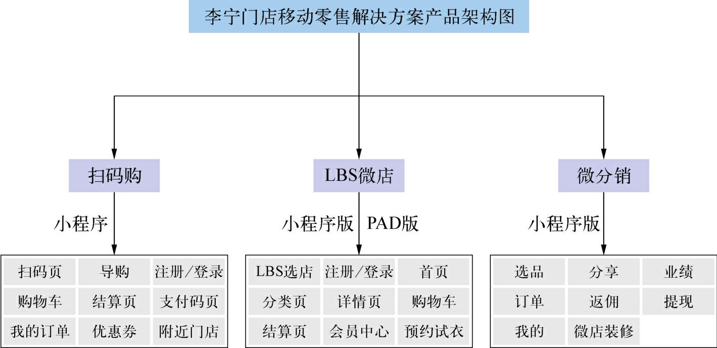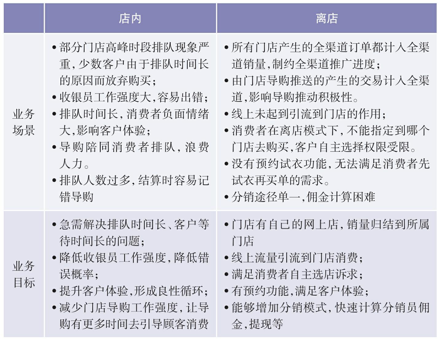 李宁是微电汇长期合作的一个客户品牌。以扫码购项目为例,该项目的着重点在于增加店内店外的扫码购物流程,提高店内运营效率,提升顾客体验(见表4.1和图4.11)。