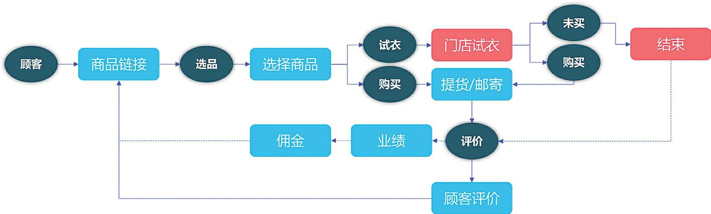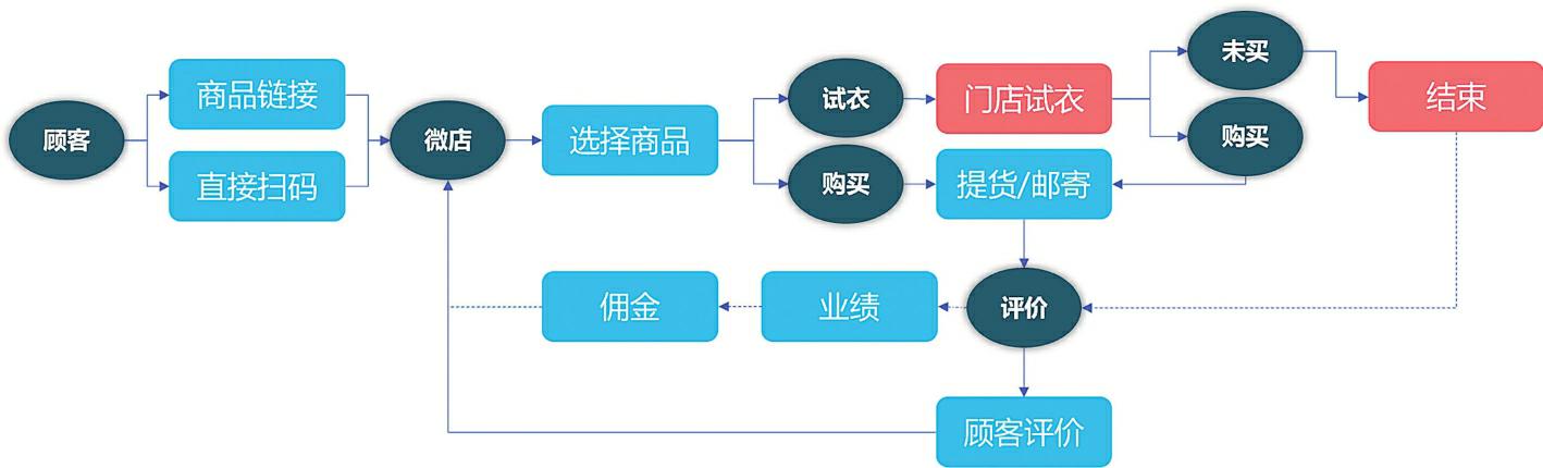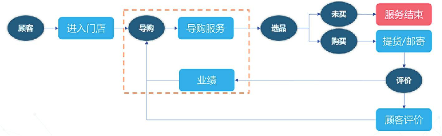 顾客进入门店——门店导购为顾客提供售前、售中服务——若交易未达成,则流程结束;若交易达成,顾客自提或收到物品后对本次服务、商品、门店进行评价——本次交易进入业绩考核、佣金结算(见图4.12)。