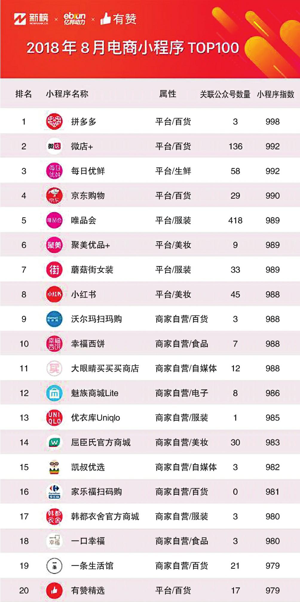 图4.15 新榜、亿邦动力和有赞联合发布的《2018年8月电商小程序TOP100榜单》(部分)
