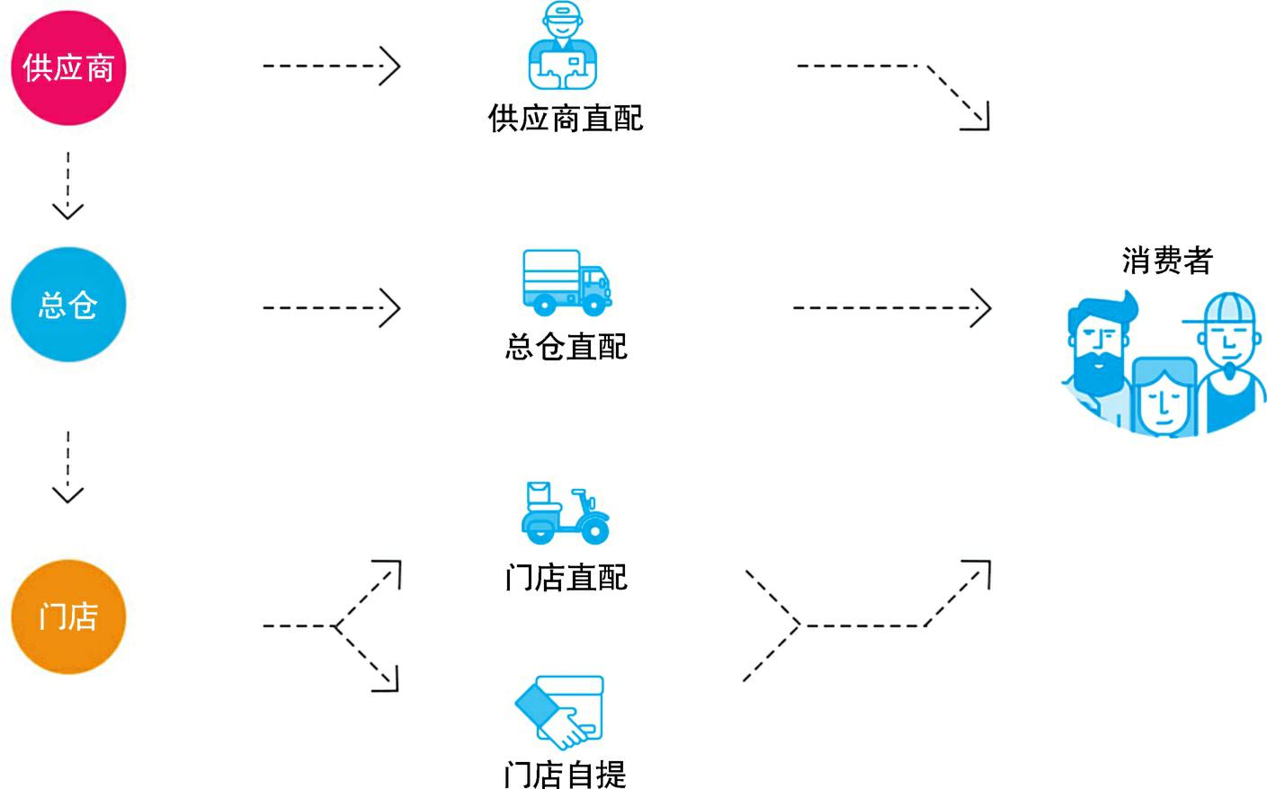 (1)移动零售前台:通过微信公众号、小程序、APP等移动触点形成的营销终端矩阵,构建极速覆盖目标顾客三公里范围内的线上平台,以门店做前置仓,打通门店级别的SKU、库存、促销、优惠券、订单,并与总部总仓形成融合经营互补。