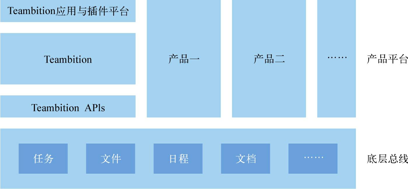 Teambition业务架构分为底层总线和产品平台两个层级。底层架构由任务、日程、文件、客户这些日常工作内容的基础能力组建而成。在底层总线平台的基础上构建出的产品矩阵包括项目协作工具Teambition、知识协作工具Thouhgts以及客户服务协作工具宾果等(见图4.21)。