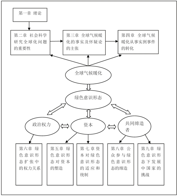 本书的各章将按照以下的结构展开(见图1-1):第一章是绪论。第二章引入全球化时代我们所面临的新问题,其中全球气候暖化就是这样一个全球性问题,世界各国都受其影响,尽管影响程度不同。第三章分析了全球气候暖化的事实基础,以及关于温室气体排放与全球气候暖化之间的因果关系的探讨中存在的不同观点。第四章分析了全球气候暖化如何从“事实”向“事件”转换,以致吸引了全世界的关注。第五章分析了在一个国家范围内绿色意识形态对资本的塑造作用。第六章将分析对象扩大到国际社会,研究了在绿色意识形态扩散下发达国家与发展中国家之间的权力关系及不平等关系的再生产。第七章分析在世界体系下资本对绿色意识形态的统制,即以“绿色”的名义扩张。第八章研究普通个人如何成为绿色意识形态发展中无意识的参与者。第九章分析了在绿色意识形态下发展中国家面临的压力和挑战。