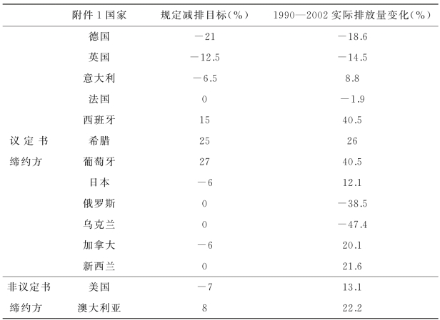 表9-1 《京都议定书》主要附件Ⅰ国家减排目标和实际排放量比较