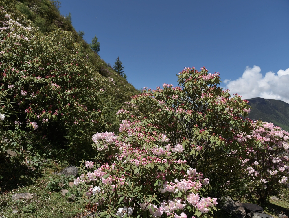 每个春夏之交,谷底至深山,杜鹃花或温婉地立于道路两旁,繁花似锦时触手可及;或依在陡峭山壁倾斜而下的瀑布边,在如雨如尘的水雾中绽放得娇羞浪漫;或隐于山林深处,行至眼前时,一抬头花开目眩;或成片占据半壁山坡,满眼深红浅红,满地落英缤纷,灿若云霞。人称“高山木本花卉之王”的杜鹃花在这个季节统领了美人们的花园。