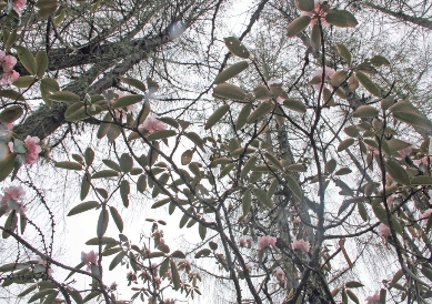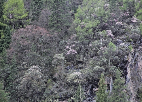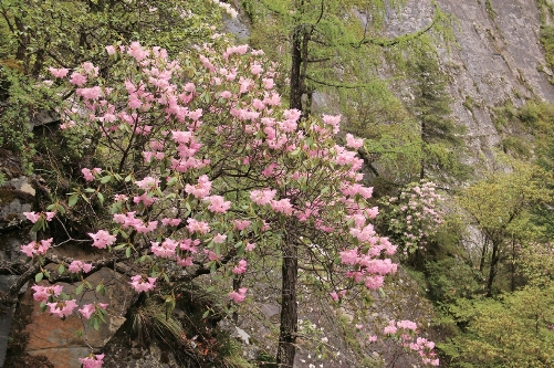 沟口山峰上拥有大片的杜鹃花,感觉非常近,其实离我们很远。进沟时经过草地,惊起一片乌鸦,遭遇蚂蟥,但这的蚂蟥挑食,它嫌弃我身体亚健康,不吸我,只吸队友杨晗。山道左侧的山涧,在洪水季节拔山移树,现在却深藏功与名,仅看见两边的泥土和横七竖八的树木。这里的杜鹃花主要为云锦杜鹃亚属的亮叶杜鹃、山光杜鹃以及过渡类型,它们和栎属混合生长,在树林中、悬崖上凹着美美的造型,枝条上一簇一簇的伞状花序,尽情绽放着娇艳与灵动。