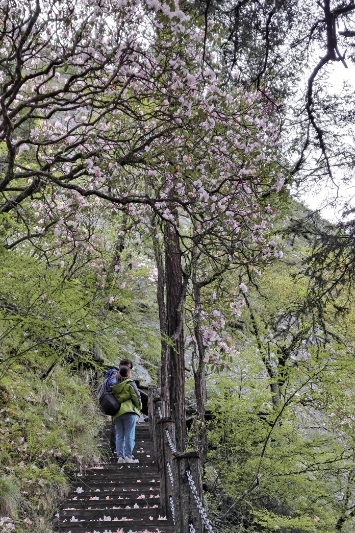 穿行在长坪沟中,头上,阳光穿透树冠,洒下万缕金光;脚下,长满青苔的沃土诉说着特有的幽静与原始,杜鹃花隐匿林中,偶几株在道旁娇羞现人。森林尽头,豁然开朗,一片草甸被群山环抱,溪流萦绕,大片的杜鹃灌丛层层叠叠,各种杜鹃花色彩斑斓,俨然进入另一番天地,然而这里的杜鹃花还算不上是长坪沟最美的。