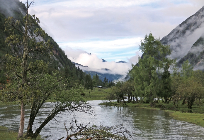 沟内溪流潺潺,蜿蜒回转,奇怪的是看不到高原冷水鱼出没。原来是长坪沟中上游为大面积花岗岩出露区 ,且沿沟分布有大量花岗岩冰川漂砾。微量元素的异常 ,干扰了鱼类磷和钙的代谢 ,使鱼类无法在此看似优美的环境中存活。