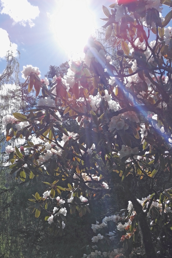 杜鹃花开时节来到嘉绒嘟瀑布,入口栈道旁是整齐高大的冷杉,走进栈道,像走进了电脑屏幕壁纸,无论色彩亦或构图皆恰到好处,又像走进了拍婚纱照的现场,唯美浪漫。过了冷杉拱门,栈道旁是形态与天府广场上飞龙雕像相似的沙棘树,与樱桃花盛开的野樱桃树。在下面马道,遥望嘉绒嘟瀑布似一道银河从两侧雪山山峰的雪谷中直落而下,沿着栈道攀升,则会发现它在山崖上分为三段,雪水激荡而下,猛烈地冲刷岩石。从这里越向上,栈道两旁沿途分布着大棵的花色粉红的杜鹃花树,有一处景色独佳:在一段略陡峭的斜坡上,背景是隐隐约约的瀑布,一棵直径大于10cm的杜鹃花树上满是粉色的花朵,严严实实地笼罩着下方的原木色栈道。栈道上空随风飘洒下花瓣,洋溢着粉色泡泡,无论成双成对还是独身,站在这里沐浴着自然特效的花雨,都会情不自禁沉浸在浪漫中。在这段栈道,能与瀑布更亲近,看瀑布由山脊穿行至密林中,怪石嶙峋,流水激荡,杜鹃繁花似锦,落英缤纷。相比虫虫脚瀑布的敞亮,这里更清幽,返景入深林,复照青苔上。