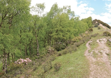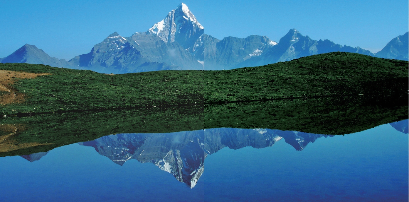 上到锅庄坪后视野开阔,往下俯瞰四姑娘山镇,往前遥望四姑娘山全貌,往后眺望猫鼻梁观景台。林缘的亮叶杜鹃连成一条优美的曲线,伴随着弯弯曲曲的山路延伸向远处的山脊。