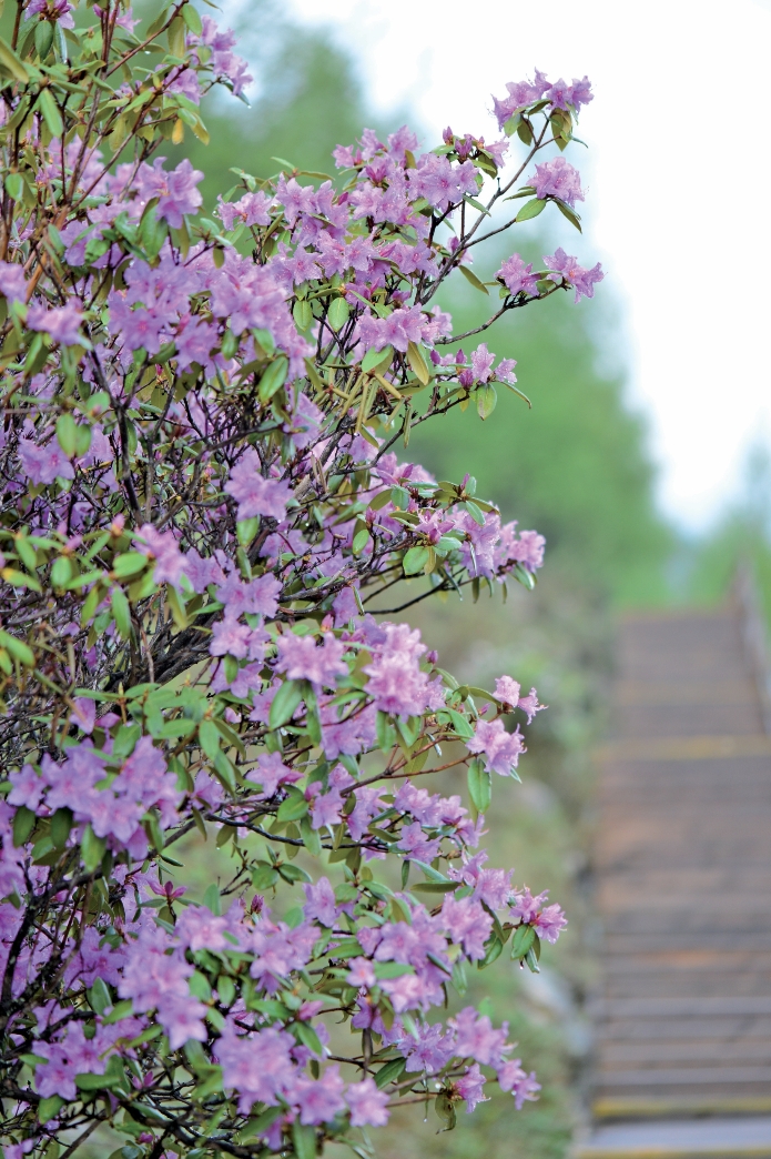若从游客服务中心的栈道缓步而上,栈道两旁的亮叶杜鹃、紫花杜鹃、秀雅杜鹃、头花杜鹃从稀疏零落到枝叶相连,热情的夹道欢迎你的到来。经过海子沟售票口,林下直枝杜鹃、草原杜鹃、北方雪层杜鹃和各色草花相伴,高山捕虫堇、云南杓兰等等小野花或散在路旁、或藏于杜鹃灌丛中,需要低头留心观察。