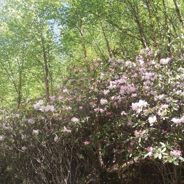 海子沟特别适合刷杜鹃花,只需到达朝山坪,就能彻底满足简单游玩与刷花,即使步行也花不了太长时间。从山脚到山门,原木栈道两侧的桦树林下布满成片的杜鹃花,触手可及,5月到6月都可在这段路上享受到杜鹃美景。