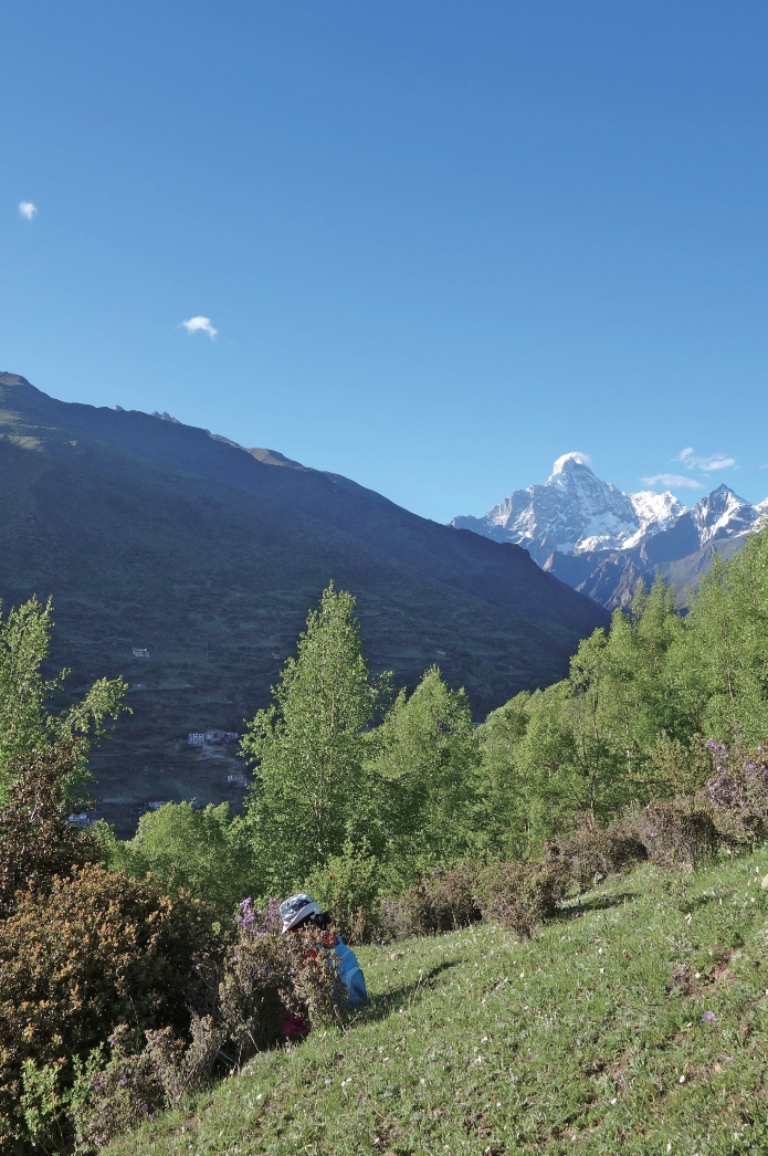 前往锅庄坪的路右侧山坡上,成片盛开着亮叶杜鹃和山光杜鹃。一路上随时可以看见四姑娘,山上的积雪和雾带。朝山坪与锅庄坪相距不远,一侧是桦树与杜鹃混合林,一侧是草甸,草甸边缘上分布着一丛丛的高山杜鹃。这里是拍摄四姑娘山四峰的最佳地点,欣赏半山风光,天高云淡,看周围杜鹃花景,绚烂绽放。这里也是当地人祭拜神山,向四姑娘山山神祈求风调雨顺、村寨平安,每年一度的朝山会所在。