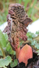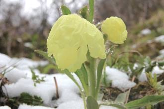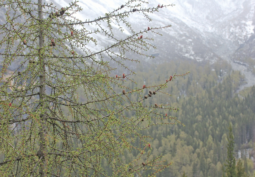 双桥沟的尽头,雪山环绕,分布着成片的四川红杉。5月下旬,四姑娘山仍时不时下雪,全缘叶绿绒蒿、青海茄参、掌叶大黄等植物已悄然探出红杉林下的雪地。