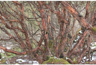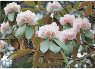 红杉林以上成片的杜鹃灌丛,曲枝成林,气势磅礴。花期远观犹如一片片粉白雾气飘荡在半山腰上。近到树下,黄毛杜鹃、栎叶杜鹃满树繁花映春雪。