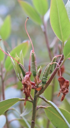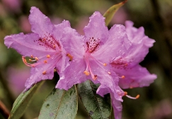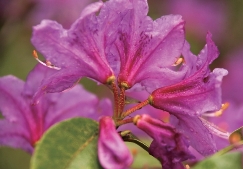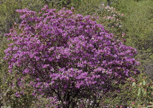 【主要识别特征】 灌木,幼枝和叶柄密披鳞,通常披细刚毛。叶片椭圆形、长圆形,长3~8cm,宽1.5~3.5cm,顶端锐尖,具短尖头;上面深绿色,披鳞,沿中脉多少披柔毛,背面淡绿色,被相距为其直径0.5~1倍、大小不等、黄褐色或褐色的鳞。花序顶生,2~5花,短总状;花梗披鳞,有或无刚毛;花萼小,5裂,裂片不明显,密披鳞,有或无缘毛;花冠宽漏斗状,长3~4cm,紫色或深紫红色,内面具更深色斑,外面疏生鳞,无毛或管部披柔毛,5深裂至中部以下;雄蕊较花冠长,花丝下部披柔毛;子房密披鳞,花柱无毛。