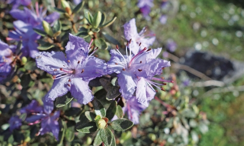 【主要识别特征】 矮灌木,小枝和叶柄披鳞。叶片椭圆形或长圆状椭圆形,顶端圆,无短突尖;表面披灰白色或淡黄色鳞片,背面淡褐色,鳞片相邻接或稍有间距;鳞片二色,鳞片无色或禾秆色,黄褐色或暗琥珀色,数量约相等而混生。花序顶生,2~8花,伞形着生;花梗披鳞;花萼带黄色,长3~6mm,5裂,不等大,长圆形或卵形,基部被疏毛或鳞片,边缘披睫毛;花冠宽漏斗状,长1~1.7cm,淡紫色或深紫、紫蓝色,内面喉部披绵毛,花管较裂片短,裂片外面不披鳞;雄蕊10,伸出,花丝近基部披毛;子房基部披白色鳞片和微柔毛,花柱较雄蕊长,近基部偶有毛。