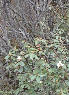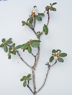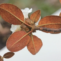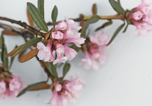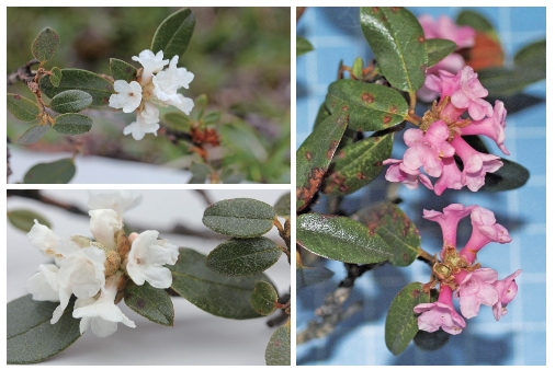 【主要识别特征】 矮小灌木,叶芽鳞脱落,小枝披鳞略有小刚毛。叶芳香,长圆状椭圆形、椭圆形或卵状长圆形,长1~2.5cm,宽0.5~1cm,顶端圆,具小尖头;叶背面鳞片相互重叠,深红褐色或深褐色,鳞片2~3层重叠着生成海绵状。花序顶生,5~8花,头状;花梗无鳞和毛;花萼明显,长3~4mm,5裂至近基部,外面无鳞或极疏生,边缘披睫毛;花冠狭管状,长1.2~1.5cm,白色或淡玫瑰花色,内面密披长绒毛,分裂至近中部,外面散生鳞;雄蕊5,包裹在花管内,花丝无毛;子房披鳞,花柱光滑。