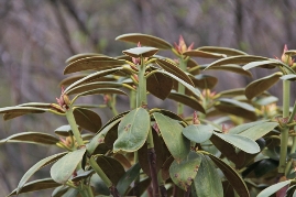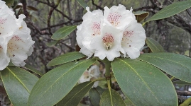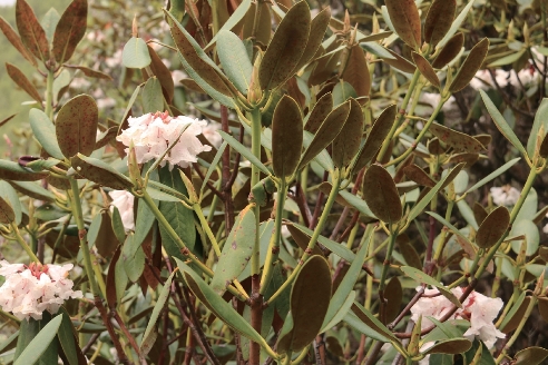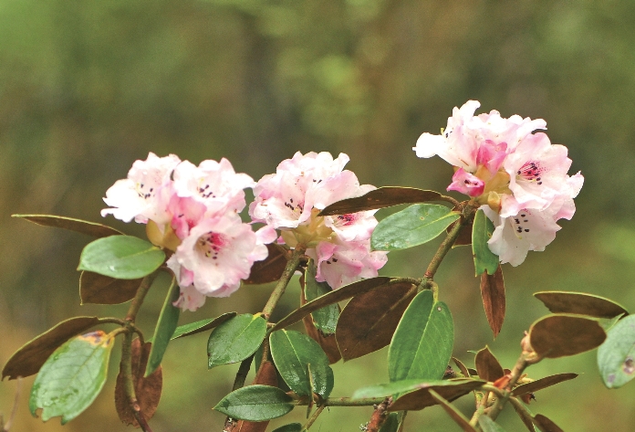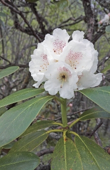 【主要识别特征】 常绿灌木。幼枝无毛。叶片革质,常集生于枝端,卵状椭圆形至椭圆形,长6~10cm,宽3~4cm,先端钝,具尖头;下面初被薄层灰白色、黄棕色至锈黄色,多少粘结的毛被,由具长芒的分枝毛组成,以后毛陆续脱落,变为无毛。顶生伞房状伞形花序,10~15花,总轴长约1cm,无毛;花梗长1~1.5cm,无毛;花萼小,具5个半圆形齿裂,无毛;花冠钟形,长2.5~3.5cm,白色至粉红色,5裂,近圆形,顶端微缺,内面具紫红色斑点;雄蕊10,花丝无毛或下半部略披柔毛;子房圆柱形,具槽,无毛,花柱无毛。
