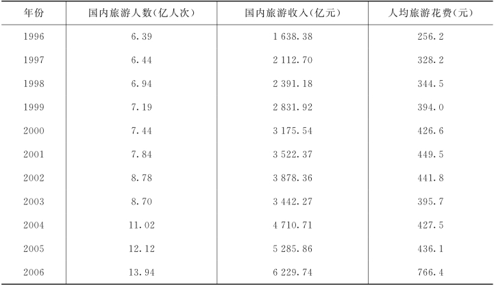 从大众旅游兴起之初的20世纪60年代至今,世界范围内的旅游业得到了迅猛发展。中国的旅游业自改革开放以来也经历了一个突飞猛进的发展过程。就国内旅游而言,1996~2006年期间,我国国内旅游的总人数和总收入分别以平均每年8.37%和14.94%的速度增长[2];截至2006年,全国国内旅游人数共计13.94亿人次,全国国内旅游总收入达6 229.74亿元[3]。近十年来我国国内旅游的详细数据可参见表1.1,除2003年因“非典”疫情导致我国国内旅游人数和旅游收入有所下降之外,从1996~2006年国内旅游无论是在出游人数、旅游收入还是人均旅游花费方面都保持着持续增长的发展势头,这在某种程度上反映出我国国内旅游业近年来的健康发展及其所取得的成就。