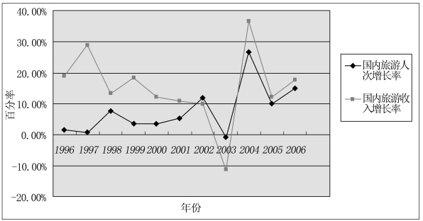 图1-1 1996~2006年中国国内旅游收入与旅游人次的增长情况