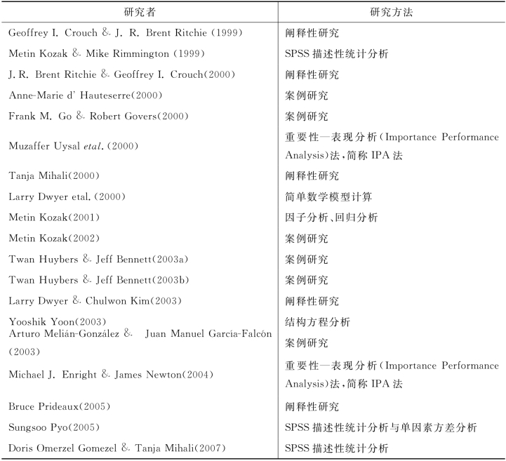 在笔者所查询到的国外有关旅游目的地竞争力研究的19篇文献中,只有5篇采用阐释性研究方法;剩余的14篇主要采用实证研究方法,它们都涉及一手数据的收集以及定量或案例研究方法的运用,具体情况参见表2-2。