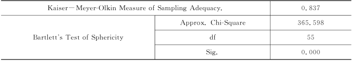 对剩余的11个题项进行因子分析,其标准是保证所提取的因子特征值大于1,因子负荷大于0.4;对那些不纳入分析会提高Cronbach's α的题项予以删除,以求达到最优化量表的目的。辅助性与支持性因素剩余的11个题项的KMO和Bartlett球度检验结果如表4-9所示。代表样本充分水平的KMO值为0.837,说明样本数量是充分的,超过了因子分析的样本限制条件;表明题项间相关程度的Bartlett球度检验的χ2统计值为365.598,其显著性水平为0.000,说明各题项间是相互关联的,提取公共因子是有条件的。