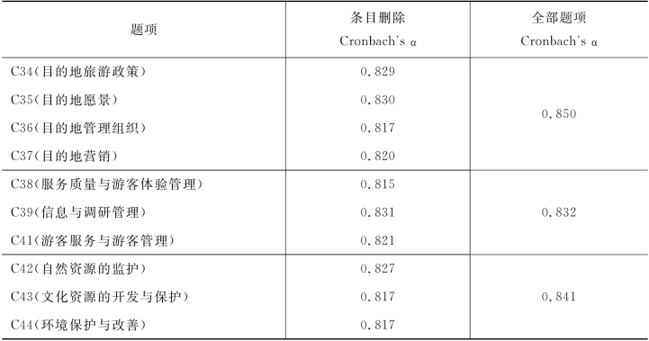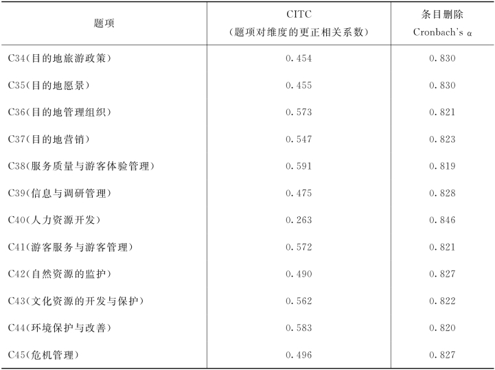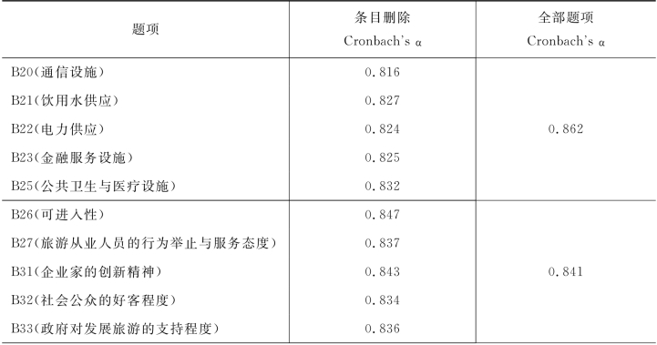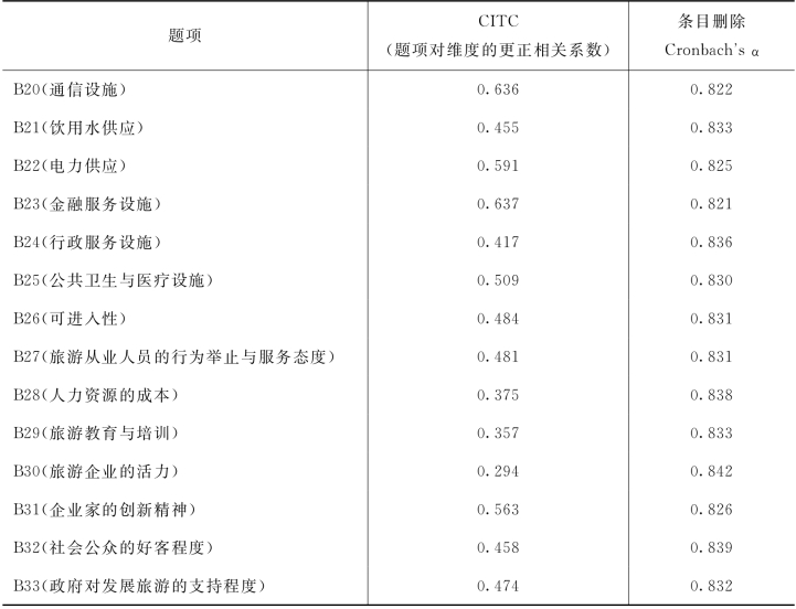 如表4-8所示,“人力资源的成本”“旅游教育与培训”以及“旅游企业的活力”三项指标的CITC小于0.4,将其删除之后剩余11个题项。