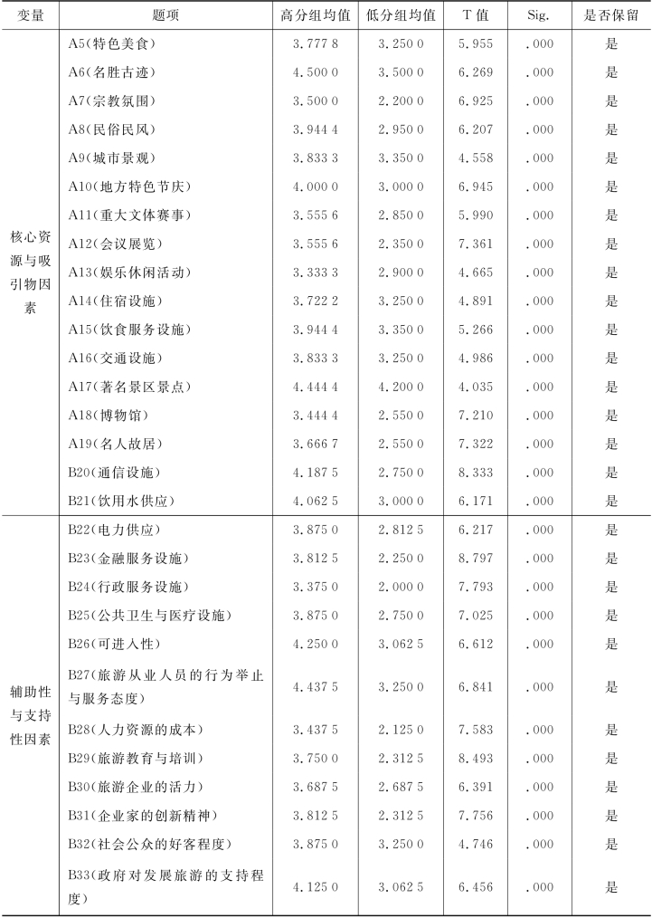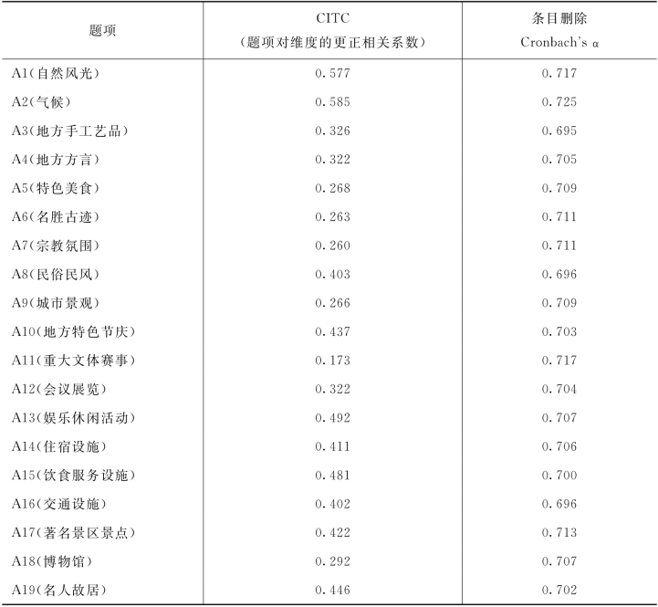 在进行因子分析之前需要借助CITC净化和消除“垃圾测试条目”,核心资源与吸引物因素的CITC及条目删除Cronbach's α系数如表4-4所示,CITC小于0.4的题项有“地方手工艺品”“地方方言”“特色美食”“名胜古迹”“宗教氛围”“城市景观”“重大文体赛事”“会议展览”以及“博物馆”等,这些题项应予以删除,删除之后核心资源与吸引物因素剩余10个题项。