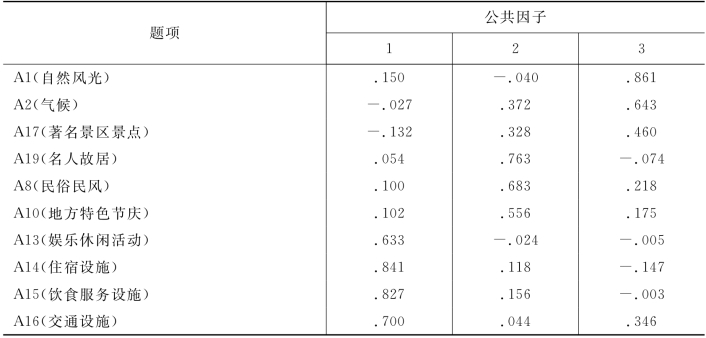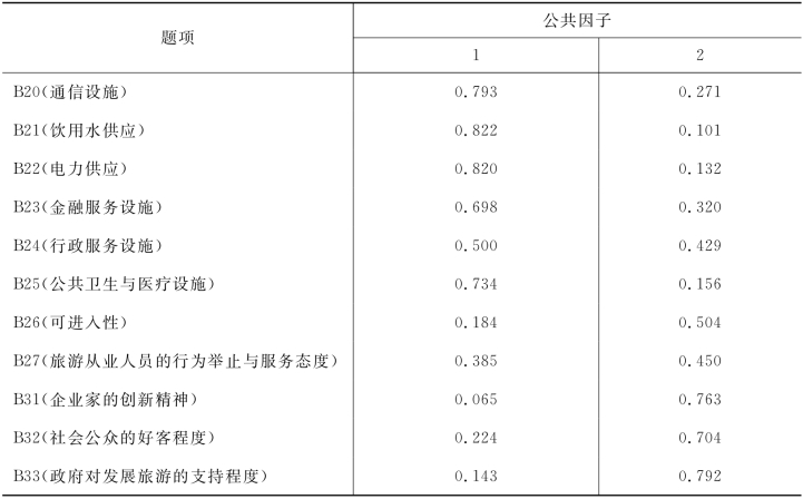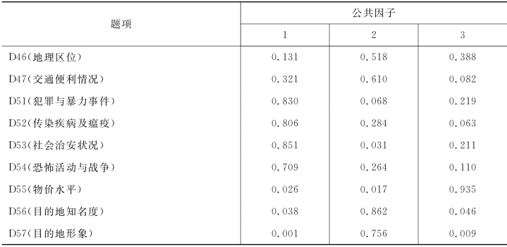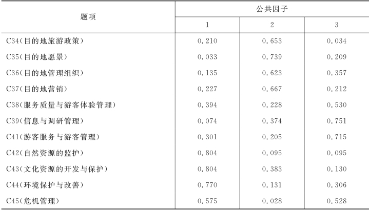 按方差最大法(Varimax)对目的地管理因素的相关变量进行旋转,得到其因子负荷矩阵(表4-14)。所有题项的因子负荷都超过了0.4,由于C45(危机管理)在两个公共因子上的因子负荷均大于0.4,按照惯例需要将其剔除。剔除该题项之后,目的地管理因素共剩余10个题项。