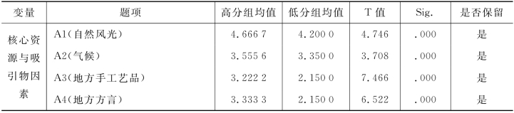 表4-4 CITC与条目删除Cronbach's α系数——核心资源与吸引物因素