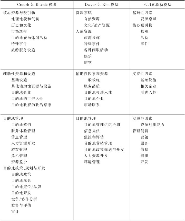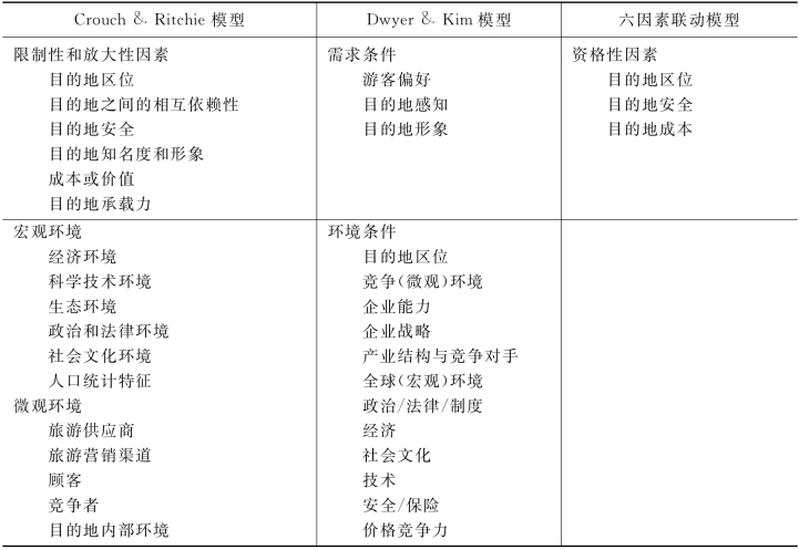 现有文献中涉及旅游目的地竞争力影响因素的模型主要有Crouch&Ritchie模型、Dwyer&Kim模型以及六因素联动模型,其中后两者是以Crouch&Ritchie模型为基础建立起来的,现将其涉及的旅游目的地竞争力的各项影响因素汇总如表4-1所示。