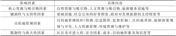 综上所述,将目的地管理与目的地政策规划与开发合并为目的地管理,将涉及旅游目的地区位、安全、物价、形象与知名度的外部环境因素以及涉及相关辅助产业情况的内部因素归为限制性与放大性因素(因为整个外部的宏观大环境对于旅游目的地来说属于不可控因素,因而此处不作涉及)。也就是说,我们可以将旅游目的地竞争力的影响因素总结为四个大的类别:核心资源与吸引物因素、辅助性与支持性因素、目的地管理因素以及限制性与放大性因素。各种影响因素的具体情况参见表4-2。
