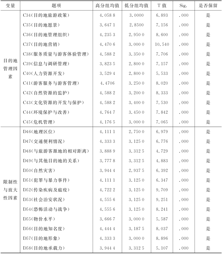 在进行因子分析之前需要借助CITC净化和消除“垃圾测试条目”,限制性与放大性因素的CITC及条目删除Cronbach's α系数参见表4-16,D48(与旅游客源地的相对距离)、D49(与其他目的地的关系)、D50(自然灾害)、D58(目的地承载力)四项的CITC小于0.4,必须将其删除。