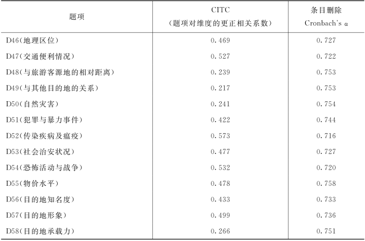 表4-12 CITC与条目删除Cronbach's α系数——目的地管理因素