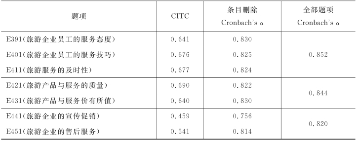 表4-40 旅游企业管理因素的条目删除Cronbach's α检验