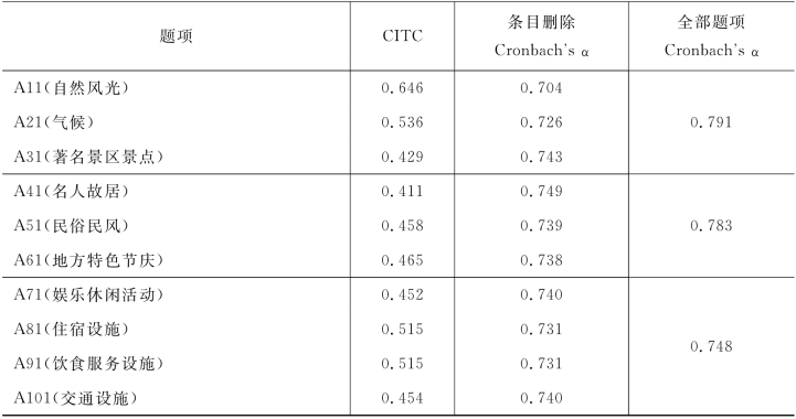 本文采用条目删除Cronbach's α系数检验,核心资源与吸引物因素的检验结果如表4-23所示,三个提取因子的组成题项在删除题项之后的α值均小于全部题项的α值,所以不需删除任何题项。