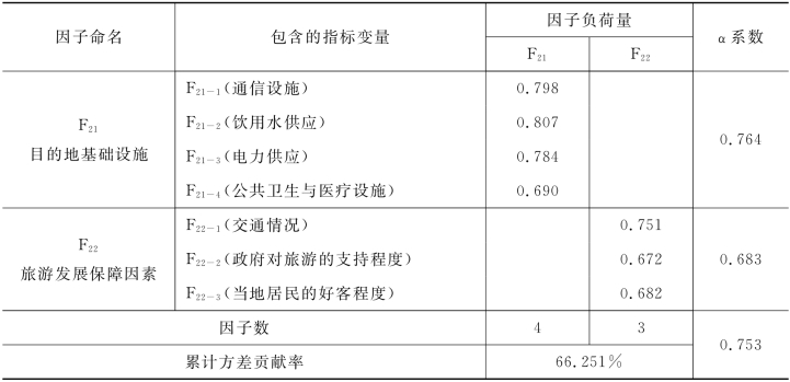 辅助性与支持性因素第二次因子分析及信度检验的结果如表4-29所示,两个公共因子的累计方差贡献率为66.251%,涵盖了原有指标的大部分信息。两个公共因子的α值均大于0.65,10项指标的信度也在0.7以上,这说明各变量内部一致性较强,总体置信度较高。根据辅助性与支持性因素的特点,将两个公共因子命名为旅游目的地基础设施和旅游发展保障因素。